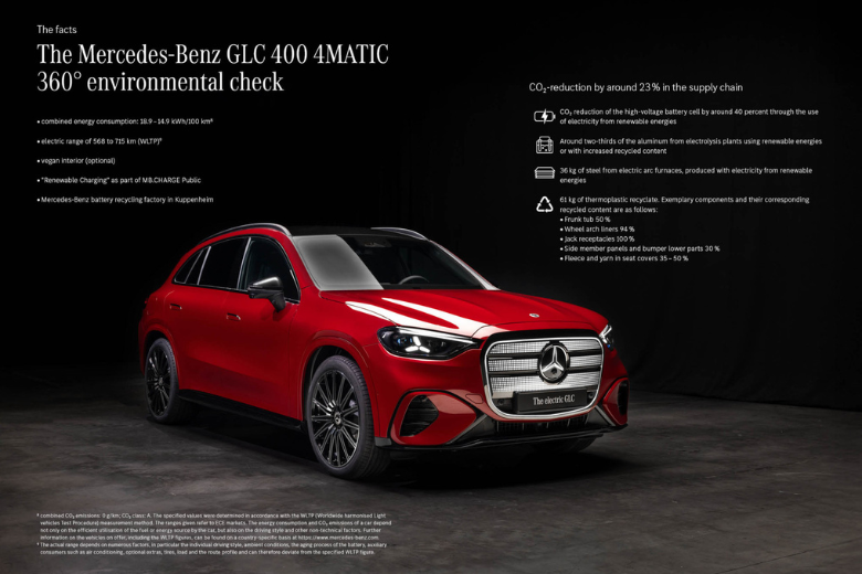 • As emissões de produção são reduzidas em 23% graças à utilização de baterias, alumínio e aço com menor pegada carbónica, ao aumento do uso de termoplásticos reciclados e ao recurso a energia renovável na fábrica de Bremen, onde o GLC elétrico é produzido
