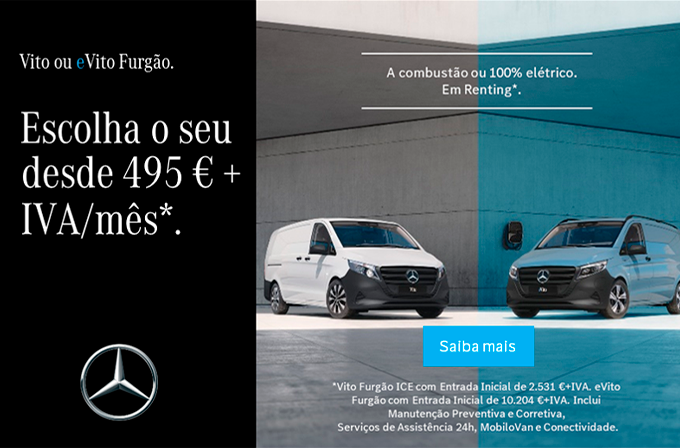 *Exemplo para Vito Furgão Standard PRO 114CDI/32 e eVito Furgão Standard (60 kWh), em Select & Drive Aluguer Operacional com renda mensal 495 €+IVA, prazo contratual de 60 meses, 30.000 km totais. Entrada inicial 2.531,45 €+IVA e 10.204,41 €+IVA, respetivamente. Inclui contrato de serviço. Acresce comissão de ativação de 321,14 €+IVA. Consumo combinado estimado (l/100km): 6,7 a 6,8. Emissões CO2 combinadas (g/km): 175 a 178. Consumo de energia combinado (kWh/100km): 21,7. Emissões CO2 combinadas (g/km): 0. Valores sujeitos a alteração de impostos e taxas em vigor. Campanha válida para contratos ativados até 31.12.2025 e sujeita à aprovação da Mercedes-Benz Aluguer de Veículos Lda.